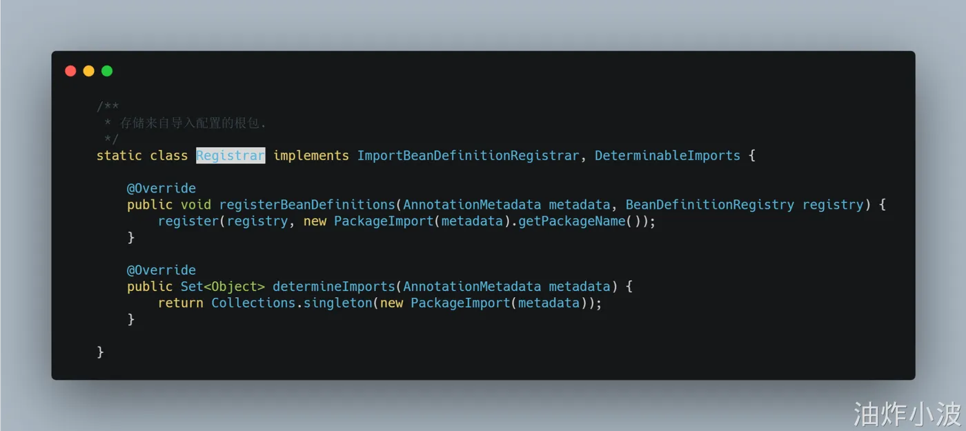 Register 实现了 ImportBeanDefinitionRegister 接口,通过它实现向IOC容器手动注册组件,在重写的 registerBeanDefinitions 方法中,调用外部类的 AutoConfigurationPackages 的 register 方法,其中传参为:new PackageImport(metadata).getPackageName(),而实例化PackageImport的有参构造方法: