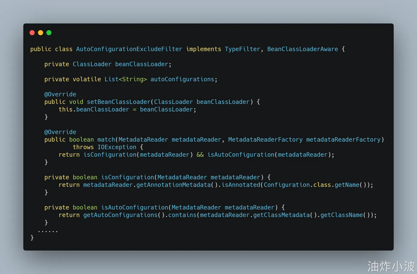其核心方法和TypeExcludeFilter一样,match()方法,但是实现有所区别,AutoConfigurationExcludeFilter的核心是:判断是否是一个配置类,且同时是否是一个自动配置的配置类