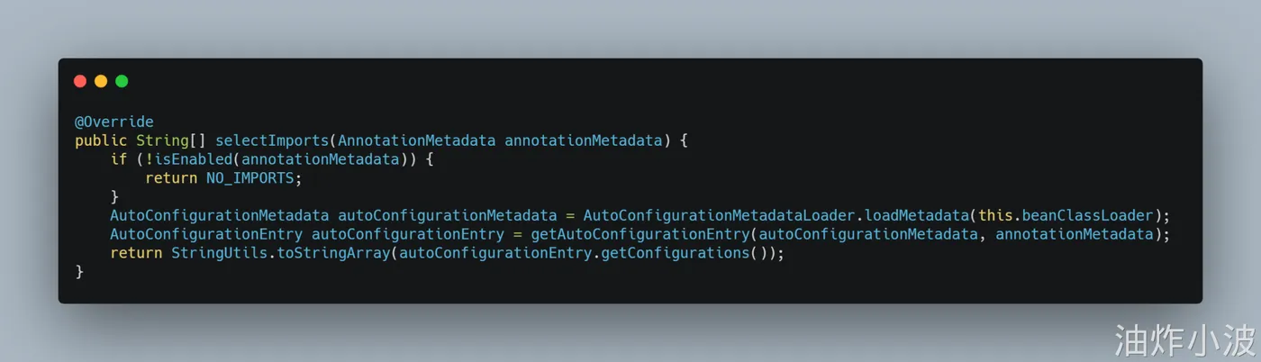 protected AutoConfigurationEntry getAutoConfigurationEntry(AutoConfigurationMetadata autoConfigurationMetadata, AnnotationMetadata annotationMetadata) { if (!isEnabled(annotationMetadata)) { return EMPTY_ENTRY; } // 1.获取所有的attributes AnnotationAttributes attributes = getAttributes(annotationMetadata); // 2.SPI机制加载自动配置类configurations List<String> configurations = getCandidateConfigurations(annotationMetadata, attributes); // 3.步骤2结果去重 configurations = removeDuplicates(configurations); // 4.基于1获取全部去重的Exclusion【过滤限制的配置项】 Set<String> exclusions = getExclusions(annotationMetadata, attributes); /** * 5.检查是否有无效Exclusion,有则抛出IllegalStateException * The following classes could not be excluded because they are not auto-configuration classes * 不能排除下列类,因为它们不是自动配置类 */ checkExcludedClasses(configurations, exclusions); // 6.清空configurations中的exclusions configurations.removeAll(exclusions); // 7.重新生成configurations,前面4.2的继承体系在这里发挥作用 configurations = filter(configurations, autoConfigurationMetadata); fireAutoConfigurationImportEvents(configurations, exclusions); return new AutoConfigurationEntry(configurations, exclusions); }