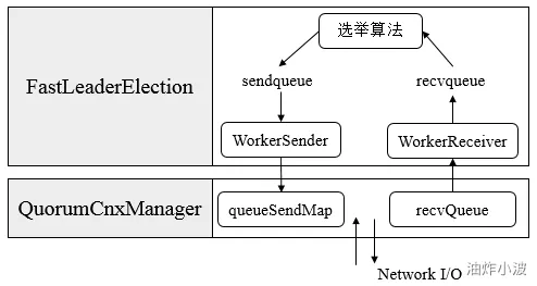 上图展示了FastLeaderElection模块是如何与底层网络I/O进行交互的。