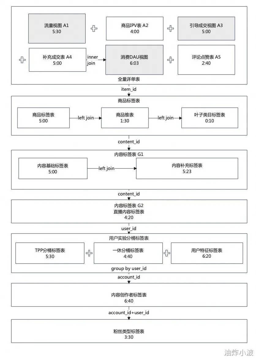 2、合并后的事实表作为主表,依次关联(left join)不同维度的标签表,例如用户维表/商品维表/内容维表等。