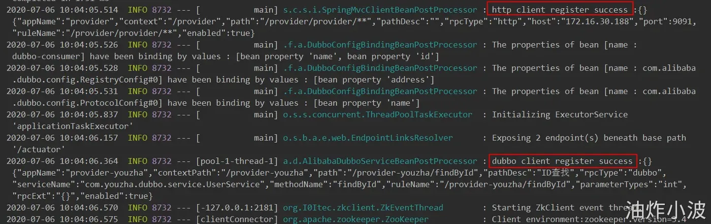 直接启动相关Application即可,出现下面的日志则表示注册成功: