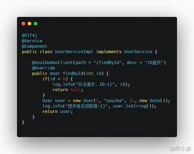 ●这里同时暴露出去了dubbo,http两套协议,dubbo对应的就是我们提供在Service层的代码,其变更很小,如下,只是增加了一个注解:@SoulDubboClient