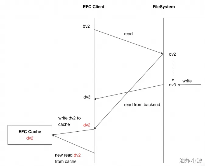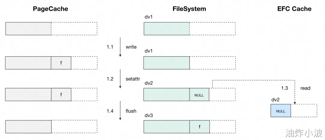 - 1.3:另一个 EFC 客户端在缓冲不命中的情况下,从文件系统读取了 dv2 版本的 NULL 数据,并写到分布式缓存中;