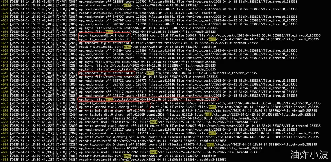 进一步查看 CTO 测试日志,记录了每次读写操作的信息。可以看到,首先通过 op_write_append 操作追加写字符 f (0x66),写的数据会首先存储在内核的 pagecache 中,然后通过 op_truncate_big 通知文件系统扩充文件长度到 610116,这样还没有被刷到文件系统的数据就是空字符 NULL (0x00)。接着通过op_fsync 将本地 pagecache 中的数据刷到文件系统。之后再通过 op_write_append 追加写字符 g (0x67)。