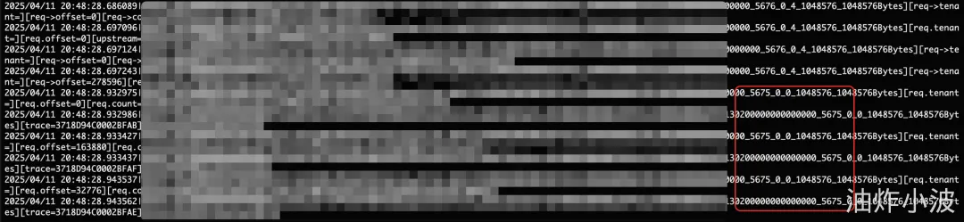 在整个 CTO 测试期间,分析 EFC 缓存的日志,存在 6 条读缓存日志,并且命中缓存的仅有 3 条,错误也就发生在这 3 次读操作中。结合错误数据的 start offset (606208) 和 end offset (606208 + 3908 = 610116) 最终可以定位到第 3 次的读操作出错(606208 < 606800 < 610018 < 610116)。
