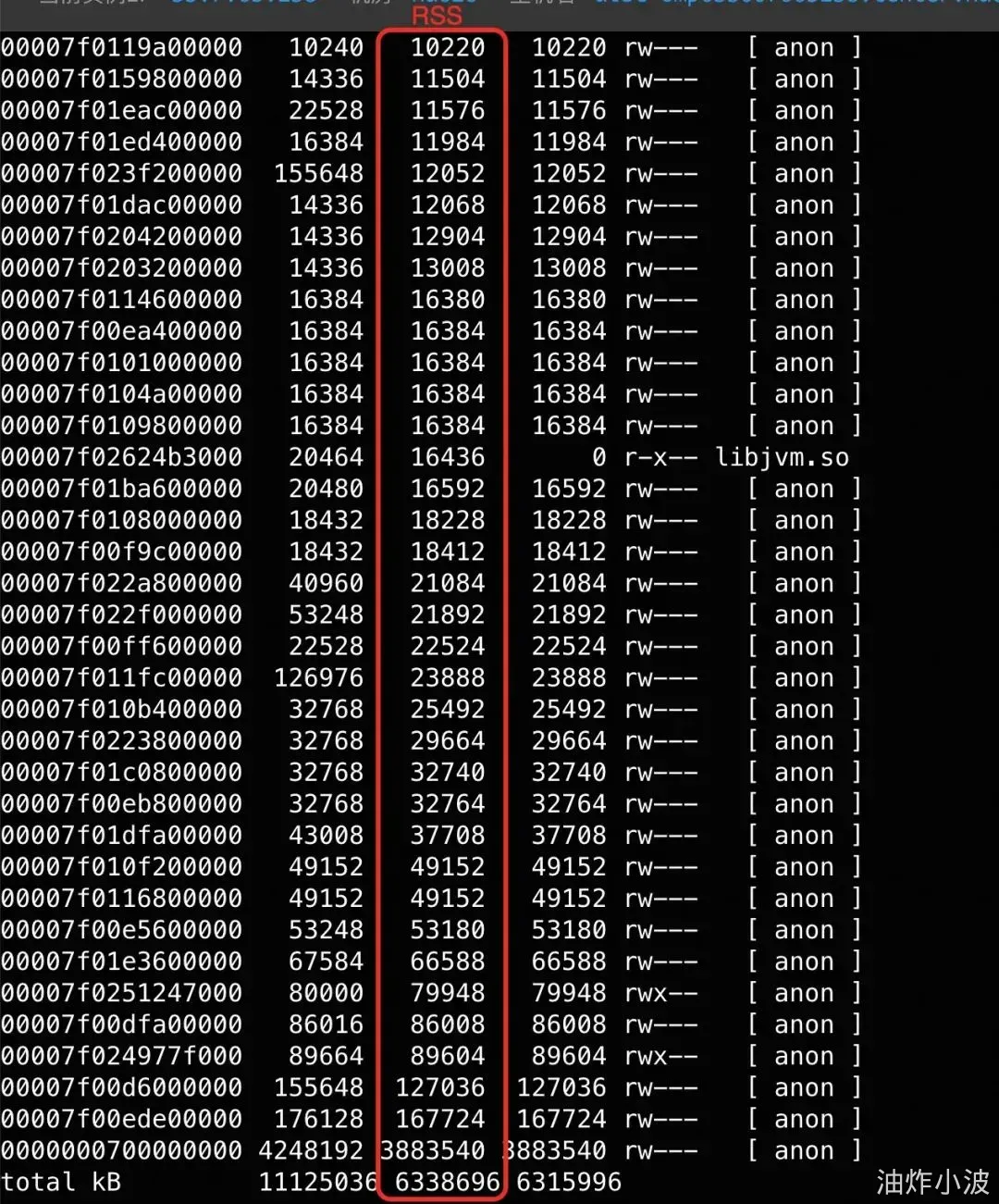 通过 sudo pmap -x `pidof java` | sort -k 3 -n 命令查看进程的所有内存块信息,如下图示: