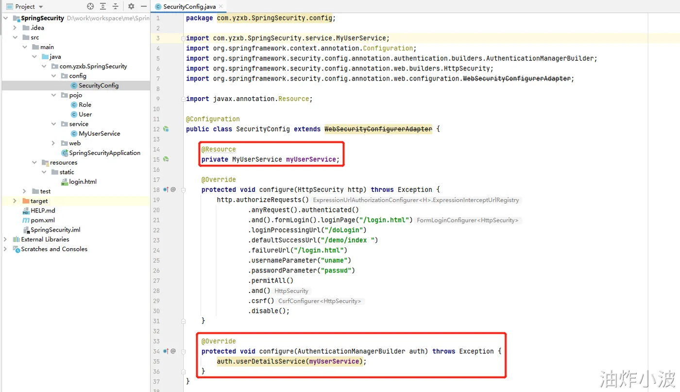 package com.yzxb.SpringSecurity.config; import com.yzxb.SpringSecurity.service.MyUserService; import org.springframework.context.annotation.Configuration; import org.springframework.security.config.annotation.authentication.builders.AuthenticationManagerBuilder; import org.springframework.security.config.annotation.web.builders.HttpSecurity; import org.springframework.security.config.annotation.web.configuration.WebSecurityConfigurerAdapter; import javax.annotation.Resource; @Configuration public class SecurityConfig extends WebSecurityConfigurerAdapter { @Resource private MyUserService myUserService; @Override protected void configure(HttpSecurity http) throws Exception { http.authorizeRequests() .anyRequest().authenticated() .and().formLogin().loginPage("/login.html") .loginProcessingUrl("/doLogin") .defaultSuccessUrl("/demo/index ") .failureUrl("/login.html") .usernameParameter("uname") .passwordParameter("passwd") .permitAll() .and() .csrf() .disable(); } @Override protected void configure(AuthenticationManagerBuilder auth) throws Exception { auth.userDetailsService(myUserService); } }