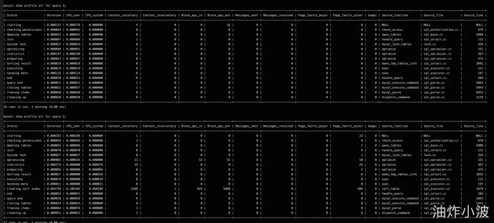 上述猜想可以通过mysql的show profile执行过程来验证,如下: