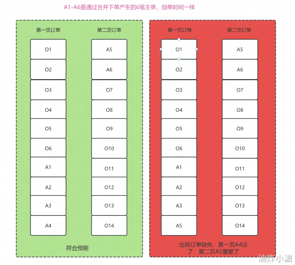 跟DBA沟通确认,走老索引ind_***_buyerid时,因为create_time字段在索引中第二个字段,create_time desc排序可以直接利用索引排序,返回的订单ID是按照索引里面固定的顺序返回。走新索引idx_****_mtid时,因为create_time是索引中倒数第三个字段,create_time desc排序只能走文件堆排,而第一页订单请求和第二页订单请求的文件堆排的排序结果可能不同,即A1-A6的顺序是不确定的,一旦两次排序顺序不同,计算分页时获取的订单就可能出现重复或者订单缺失的问题,比如第一页订单请求时排序是A1,A2,A3,A5,A4,A6,取前面4条,第二页订单请求时排序是A1,A2,A3,A4,A5,A6,取后面2条,即出现A4缺失,A5重复的问题。