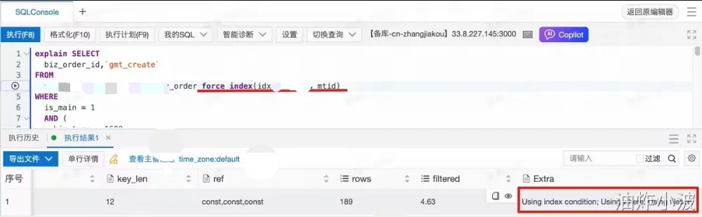 该用户下创单最早的订单都是大于2025-01-01,初步怀疑create_time大于2025-01-01的查询条件被索引选择器直接忽略。如果把查询时间去掉,也是走新索引 idx_****_mtid,相比老索引可以有更多的字段走索引过滤,符合预期。