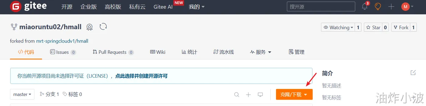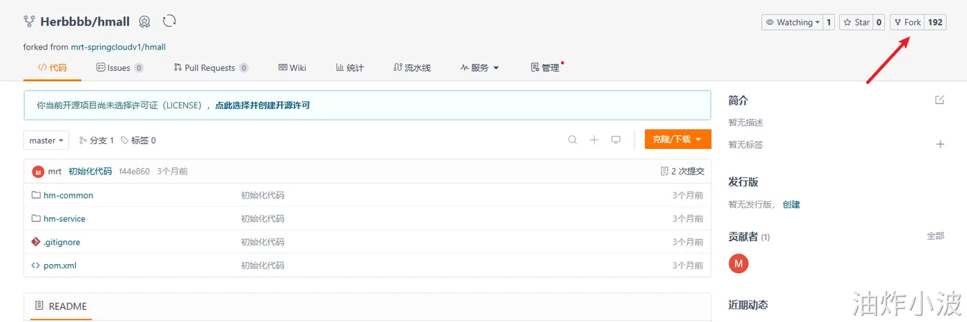 登录gitee,然后在浏览器输入:https://gitee.com/Herbbbb/hmall, 仓库地址,点击"Fork",如下图: