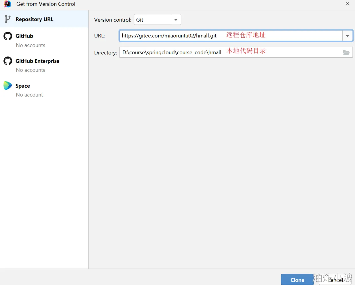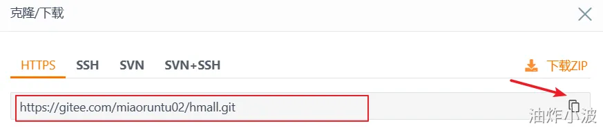 点击“确定”复制成功,此时 hmall 工程已复制到自己的仓库中,点击“克隆/下载”,复制仓库地址