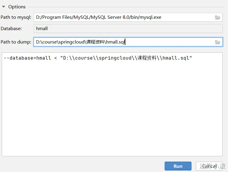 要启动该项目需要创建数据库,首先创建数据库“hmall”,再导入课程资料下的“hmall.sql”,