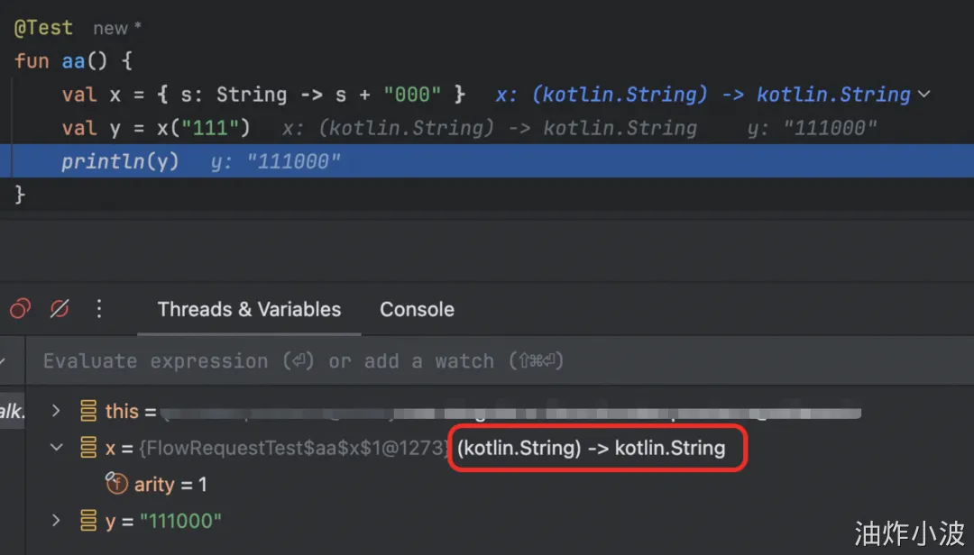 为了更清晰地了解这个语法,可以看下面这个例子:这里定义了一个函数式变量x,入参为s,出参为s+“000”。在使用时可以直接以函数的方式调用x,最终得到y=111000