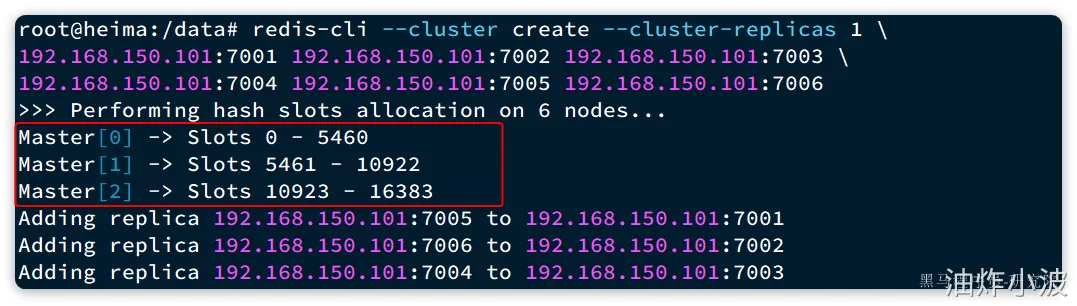 在Redis集群中,共有16384个hash slots,集群中的每一个master节点都会分配一定数量的hash slots。具体的分配在集群创建时就已经指定了:
