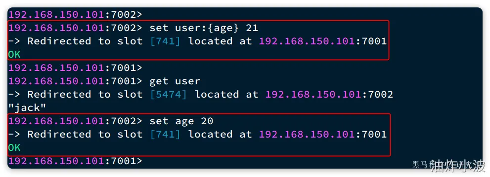 # 试一下key中带{} set user:{age} 21 # 再试一下key中不带{} set age 20
