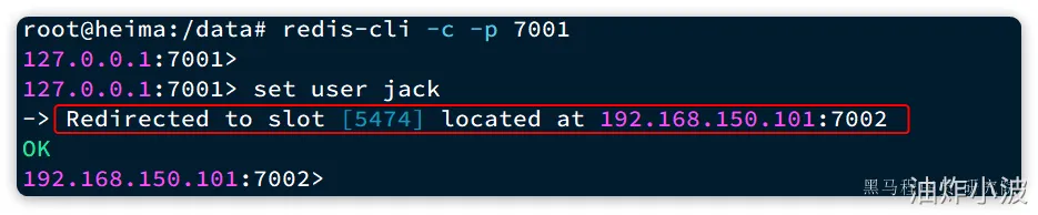 # 进入容器 docker exec -it r1 bash # 进入redis-cli,这里要加-c表示连接集群 redis-cli -c -p 7001 # 测试 set user jack