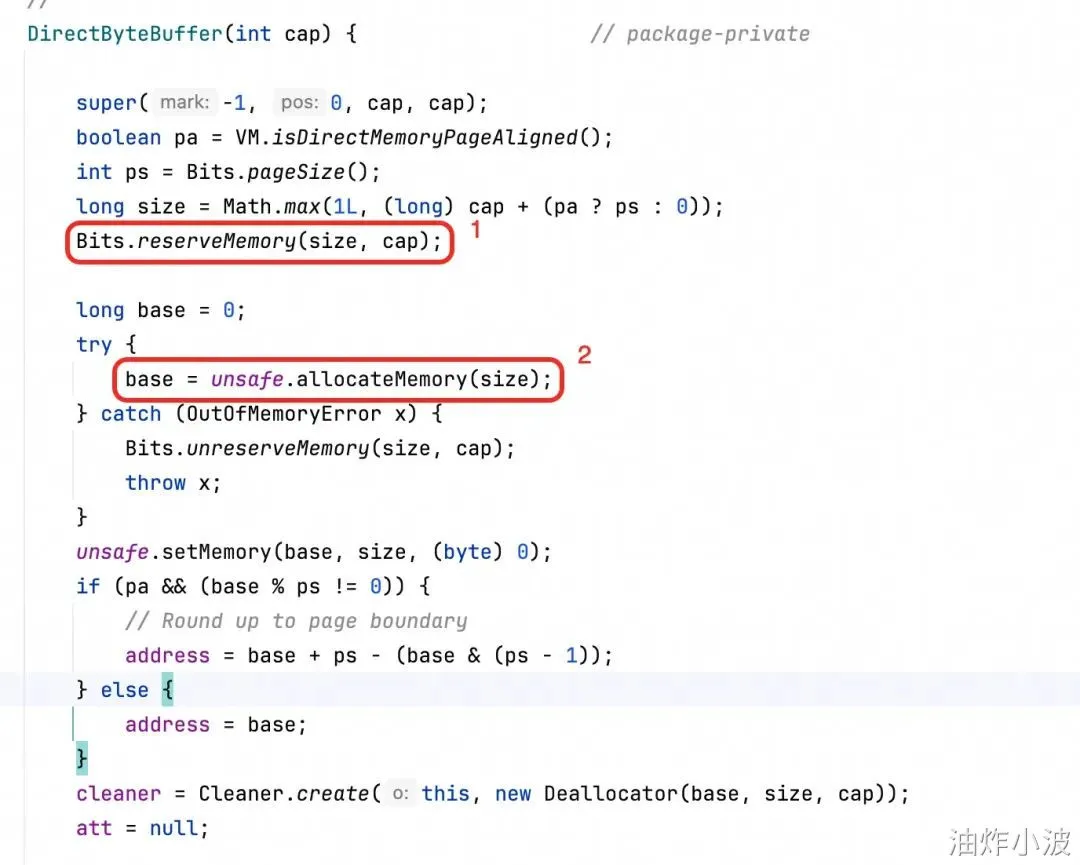 查看DirectByteBuffer实现代码可以发现,它限制MaxDirectMemorySize的方法是在Java层(代码标记处1),实际上在JVM底层是没有任何限制的,netty是直接用了这里代码标记处2的API分配内存。