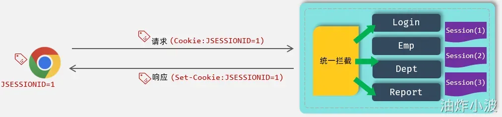 ●浏览器接收到Cookie之后,就会自动将Cookie的值(JSESSIONID)存储起来,然后在后续访问服务器的时候,再将Cookie的值(JSESSIONID)携带到服务器。 在服务器中,就可以根据 JSESSIONID的值,找到对应的会话对象Session,从而操作会话对象Session中的数据了。