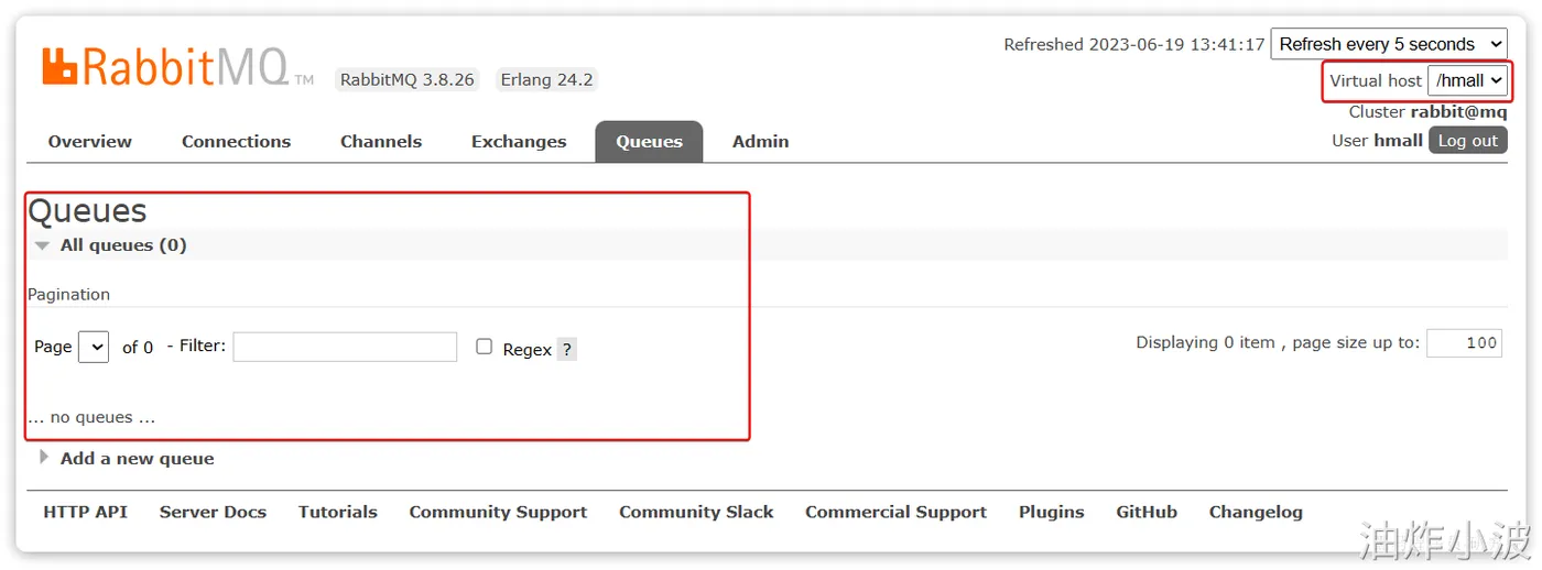 切换到刚刚创建的hmall用户登录,然后点击Virtual Hosts菜单,进入virtual host管理页: