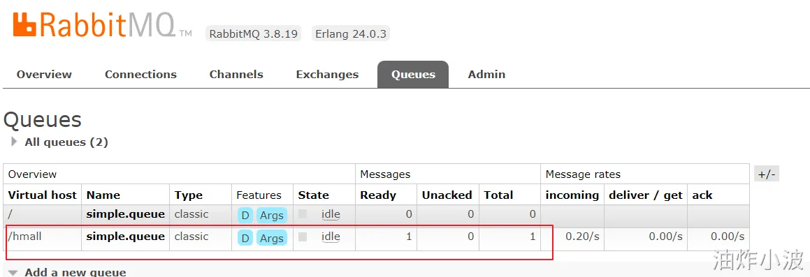 重新进行收发消息的测试,发现消息发发放到了virtual-host: /hmall 下的队列,如下图: