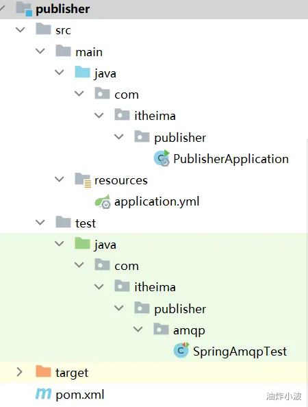 然后在publisher服务的test下编写测试类SpringAmqpTest,并利用RabbitTemplate实现消息发送: