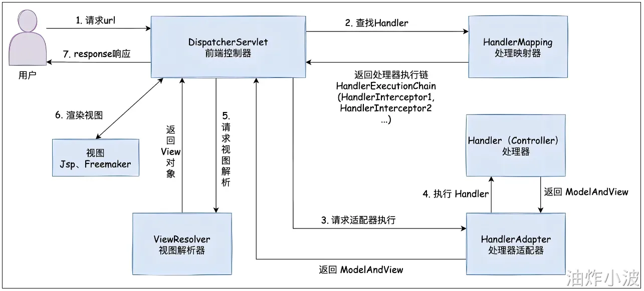 简介: 本章介绍SpringMVC框架核心组件及工作流程,包括DispatcherServlet、HandlerMapping、HandlerAdapter、Handler与ViewResolver的作用与协作机制,并详解请求处理流程、拦截器应用、异常处理及常用注解如@RequestMapping、@RequestBody等,帮助理解Web层开发关键技术。