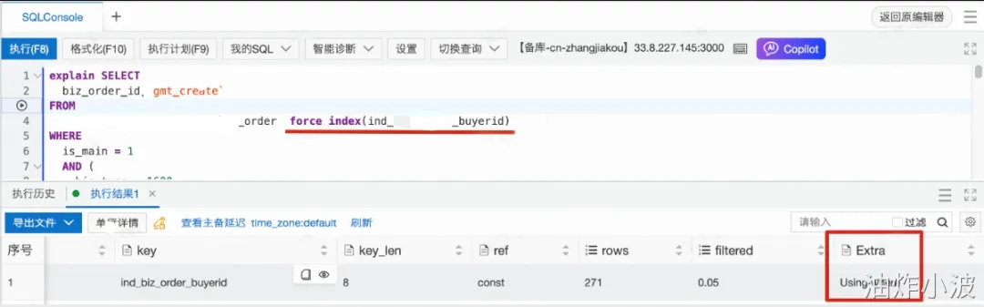 在dms上通过force index指定索引的方式复现了上述问题,发现走老索引没问题,走新索引有问题,二者的explain差异如下: