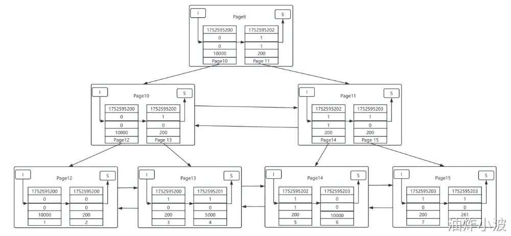 B+Tree中单个节点实际对应一个16kb的物理Page,Page的Fil Header中会维护两个链表指针,指向相邻的两个Page,通过这两个指针,每一层的Page都会组成一个横向的Page双向链表,从而支持双向遍历,提升列表查询效率。每个Page中会包含多条索引记录Record,各个Record在逻辑上基于索引列值升序排列并组成一个单向链表,这些称为User Records。Page内预留了两个固定位置固定值的System Records,在链表头的Infimum记录以及在链表尾的Supremum记录,Infimum指向索引值最小的Record,Supremum通常为null。Page内部还会维护一组Directory slot,每个Directory slot指向一个Record记录,两个Directory slot对应的Record记录中间会相隔4到8个Record记录,实际在Page内部查找满足条件的Record记录时先根据Directory slot做二分查找找到相邻的两个slot记录,再顺序遍历这两个slot中间的Record记录,从而提升查找效率。