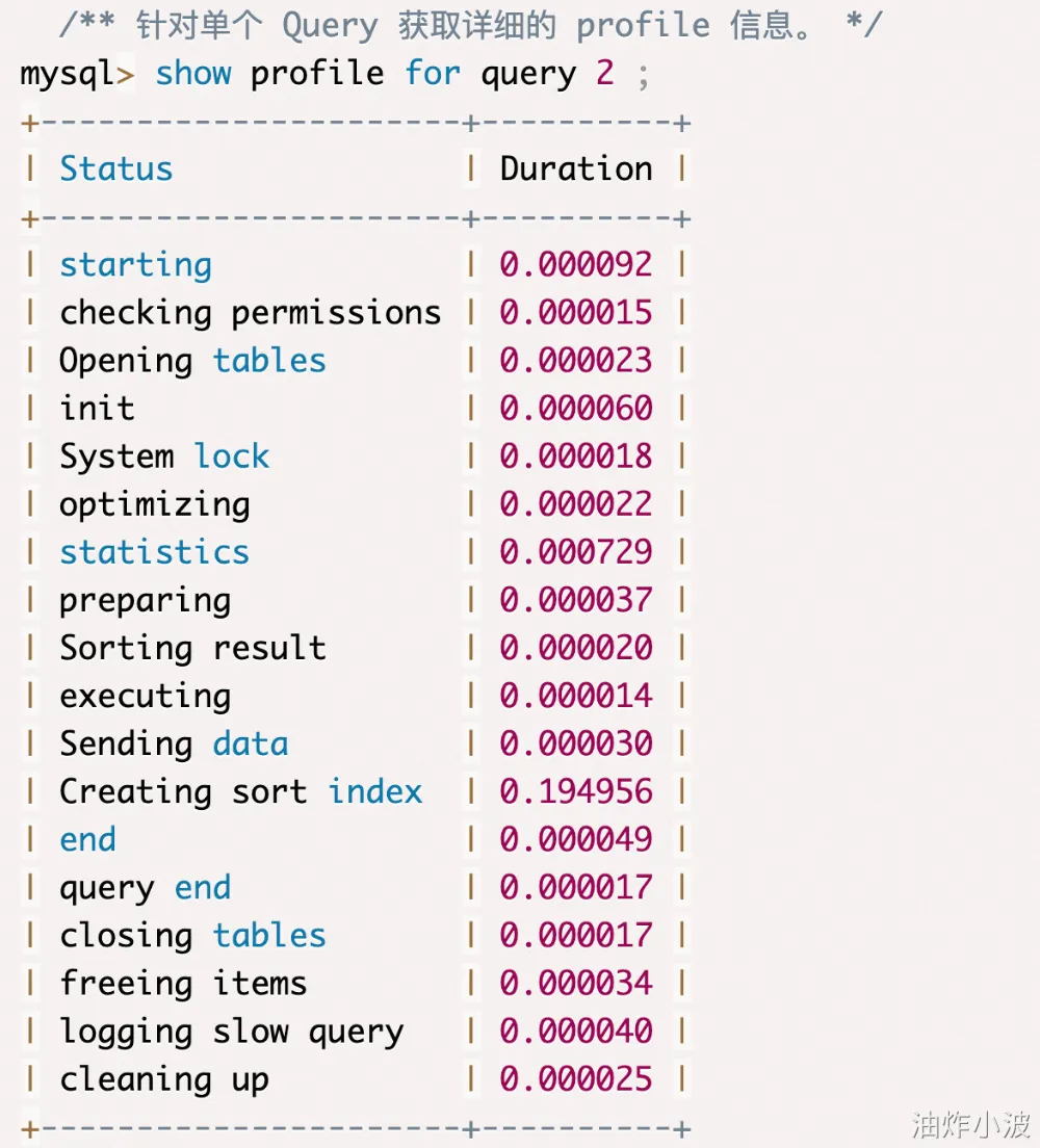查看具体的profile信息,type取值可以是 ALL\BLOCK IO等,多个type之间用逗号间隔。FOR QUERY n中的n是SHOW PROFILES中的编号,可以查看指定缓存的Profiling信息。LIMIT OFFSET控制的是一条查询的Profiling信息中输出哪部分行(阶段)的信息。直接执行SHOW PROFILE展示的是最新一条被缓存的Profiling信息 |