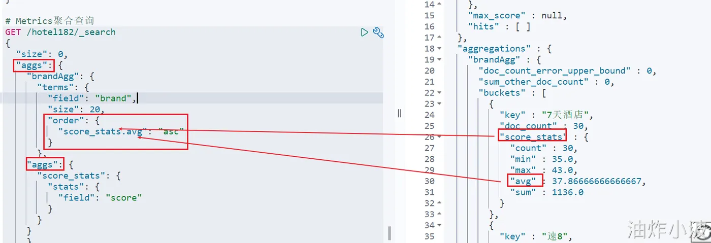 这次的score_stats聚合是在brandAgg的聚合内部嵌套的子聚合。因为我们需要在每个桶分别计算。另外,我们还可以给聚合结果做个排序,例如按照每个桶的酒店平均分做排序: