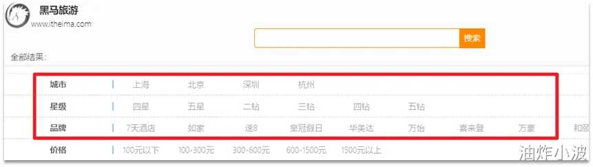 分析:目前,页面的城市列表、星级列表、品牌列表都是写死的,并不会随着搜索结果的变化而变化。但是用户搜索条件改变时,搜索结果会跟着变化。例如:用户搜索“东方明珠”,那搜索的酒店肯定是在上海东方明珠附近,因此,城市只能是上海,此时城市列表中就不应该显示北京、深圳、杭州这些信息了。