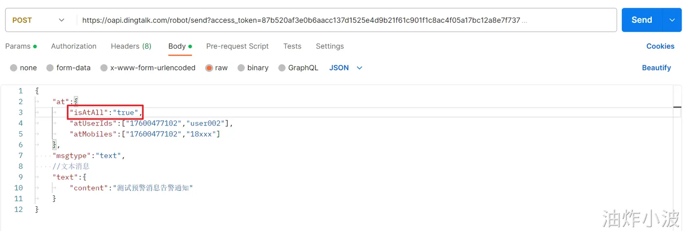 - at,标识群里@哪些人,如果isAtAll就标识@群里所有人,@atMobiles标识指定手机号,其余参数同理