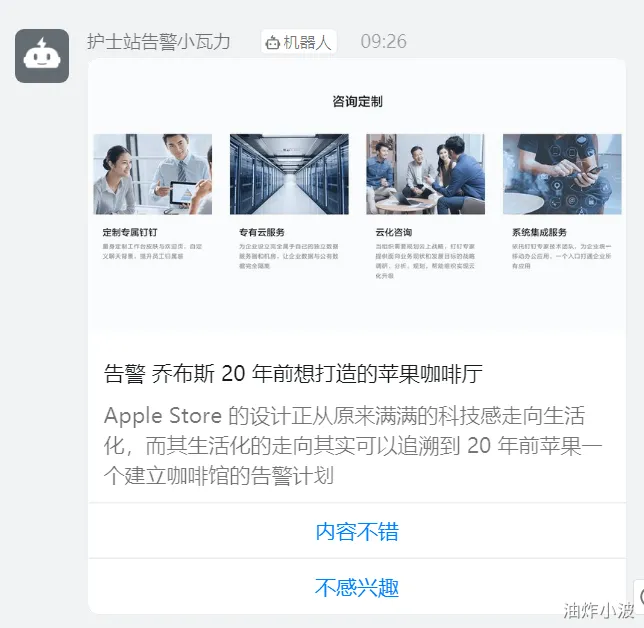 如果有大量发消息的场景(譬如系统监控报警)可以将这些信息进行整合,通过markdown消息以摘要的形式发送到群