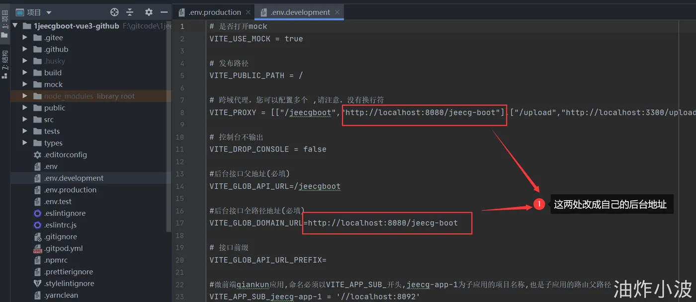 # 跨域代理,您可以配置多个, 请注意没有换行符 VITE_PROXY = [["/jeecgboot","http://localhost:8080/jeecg-boot"],["/upload","http://localhost:3300/upload"]] #后台接口全路径地址(必填) VITE_GLOB_DOMAIN_URL=http://localhost:8080/jeecg-boot