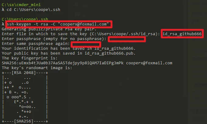cd C:\Users\<你的用户名>\.ssh # 进入指定路径 ssh-keygen -t rsa -C "cooperx@foxmail.com" # 注册用户名邮箱 # 自定义设置用户名 # 两次回车确认密码 ------------------------------------------------------------------------------------------ # 切换终端到bash环境(Windows下在.ssh目录右键打开git bash进入) ssh-agent bash # 没有提示代表切换成功,这一步不可或缺 ssh-agent id_rsa_xxx # 添加注册ssh,提示 Indentity 为成功 ----------------------------------------------------------------------------------------- ssh -T git@xxxxxx.com # 测试代码平台连通性,注意T是大写