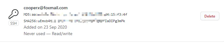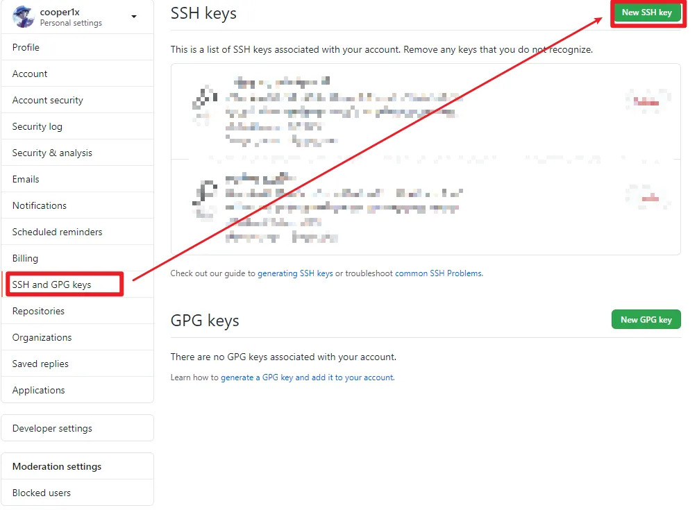 进入设置页面后,左侧栏选择【SSH and GPG keys】,进入SSH keys页面,可以看到历史创建过的SSH keys信息。