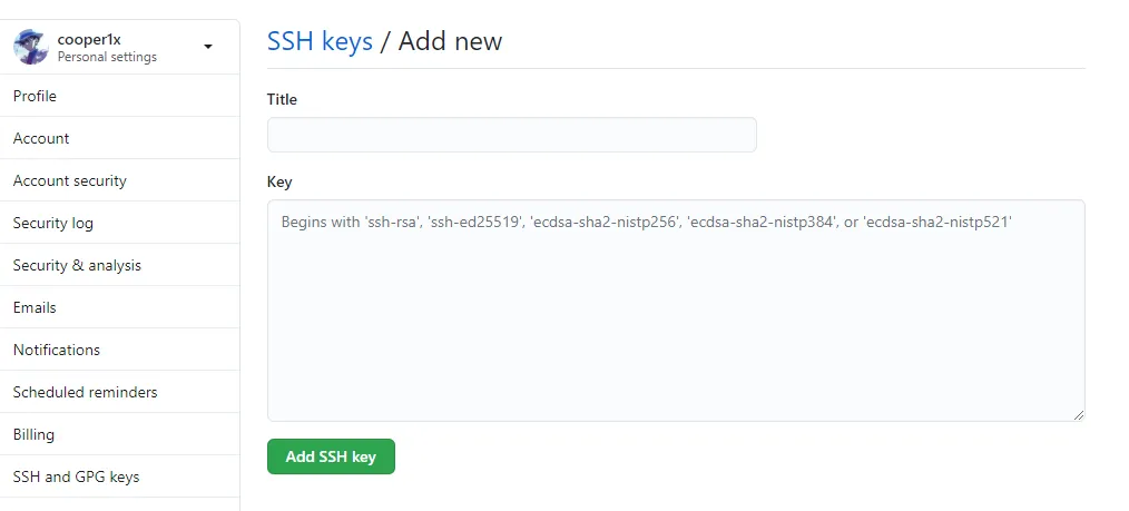 Github 添加SSH key 页面