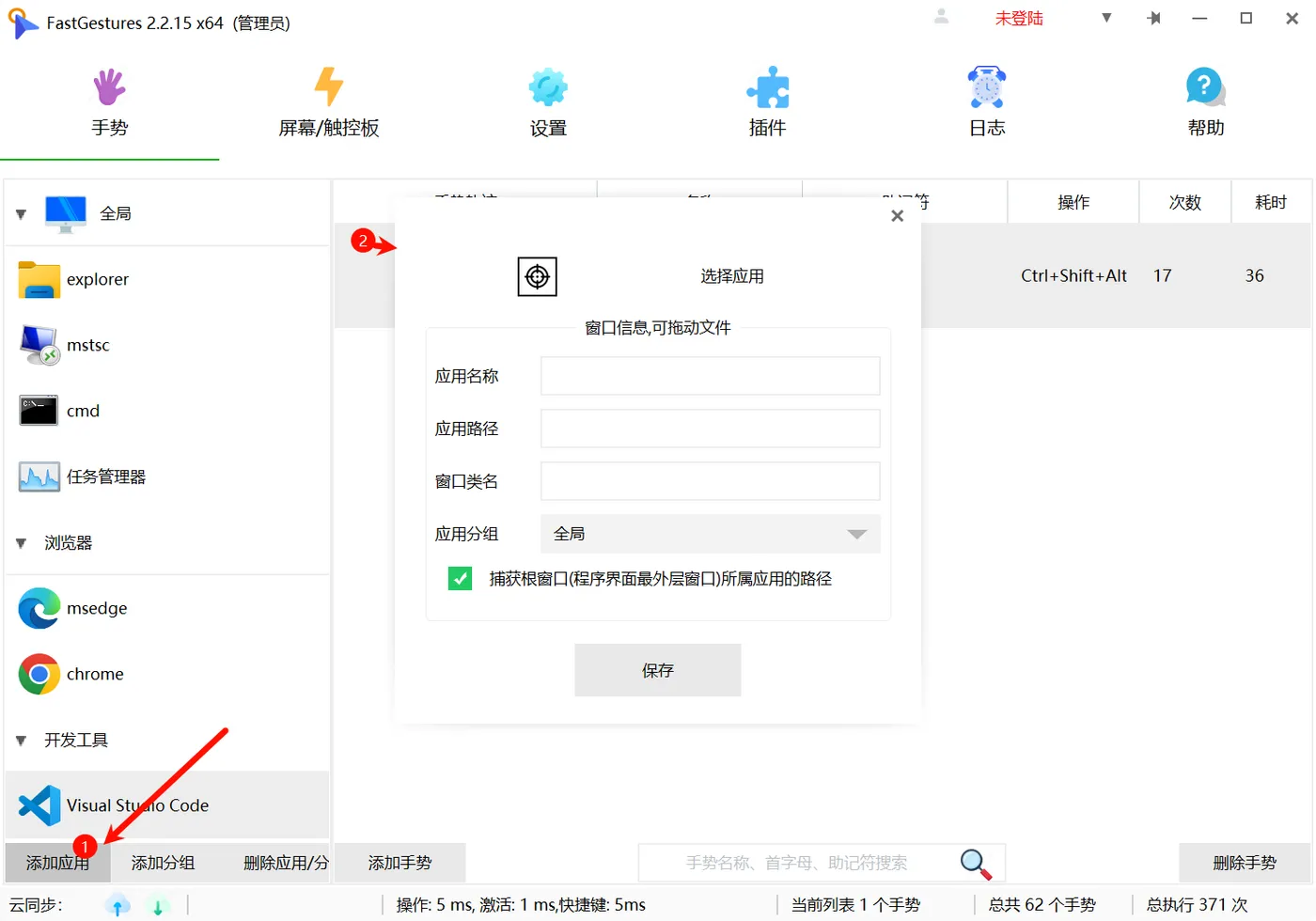 在FastGestures 软件中,新建一个应用,你可以按住选择应用左边的按钮,拖动到VSCode窗体上捕获这个应用。