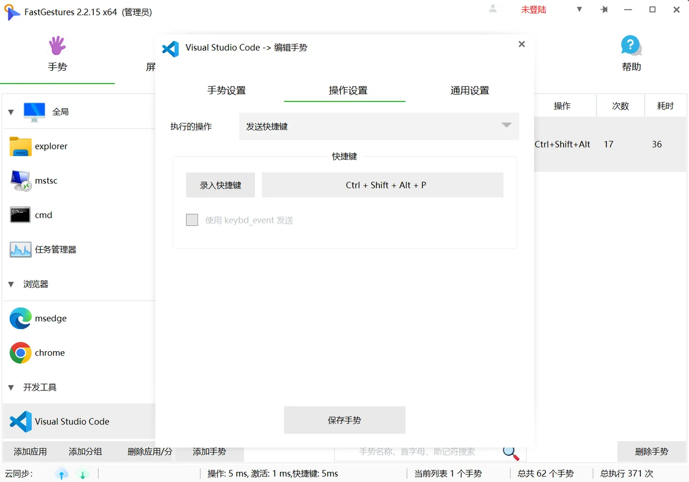 接着你可以添加手势,操作设置更改为发送快捷键,录入刚刚设置的Ctrl+Shift+Alt+P即可。