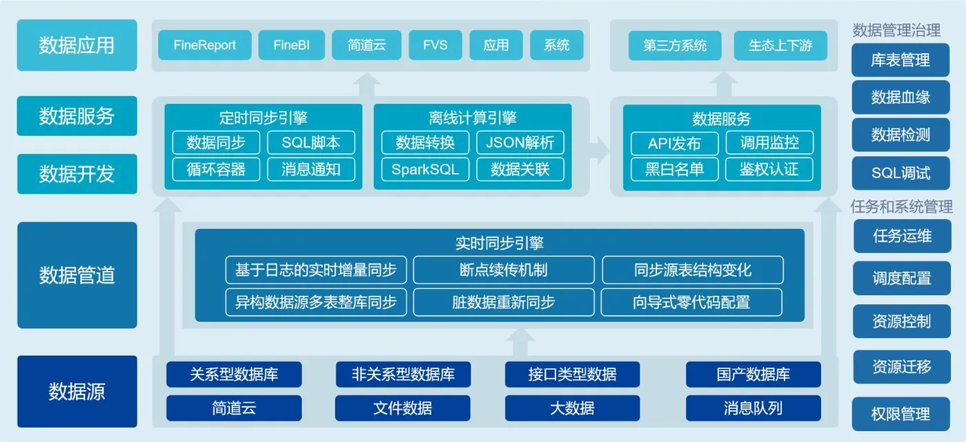 - 数据服务:例如,提供基于数据的分析咨询服务、模型训练服务、或定制化的数据解决方案。 这个阶段,重点在于以市场或用户需求为导向,进行数据开发、加工和封装。数据产品必须稳定、可靠、可持续供应。此时,底层数据加工管道的稳定性和自动化水平,直接决定了数据产品的“交货”质量和效率。FineDataLink 所保障的稳定数据流水线,就成为了支撑数据产品持续迭代和交付的“生命线”。