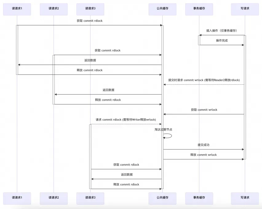 使用提交读写锁(commit rwlock)实现读请求与写请求之间的并发安全。如下图所示,读请求全程持有提交读锁(commit rdlock),写请求在执行插入算法的过程中,仅操作线程创建的事务缓存,直到事务提交时,请求公共缓存的提交写锁(commit wrlock),淘汰公共缓存中的过期节点。所以总的来说,提交读写锁(commit rwlock)保障了读请求与写提交之间的读写并发安全。