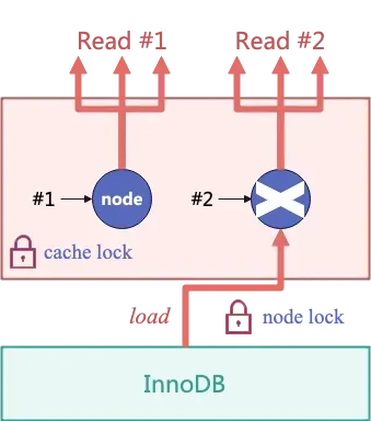 获取了节点的线程若发现节点为空,则需要从 InnoDB 引擎加载,使用节点锁(lock_node)保证只有一个线程去 InnoDB 引擎请求节点信息。