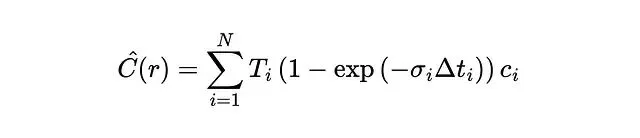 Tᵢ是光线存活到第i个区间之前的概率。那光线在第i个区间内终止的概率呢?可以用密度来算: