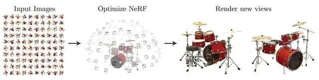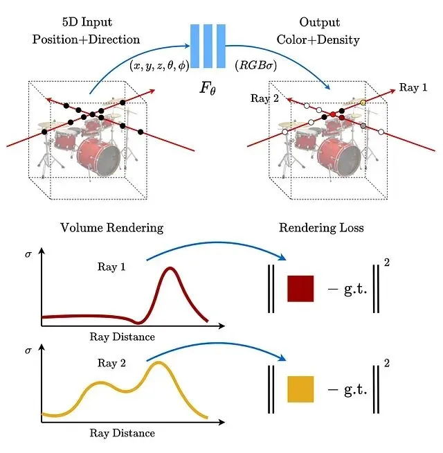 NeRF(Neural Radiance Fields,神经辐射场)的核心思路是用一个全连接网络表示三维场景。输入是5D向量空间坐标(x, y, z)加上视角方向(θ, φ),输出则是该点的颜色和体积密度。训练的数据则是同一物体从不同角度拍摄的若干张照片。