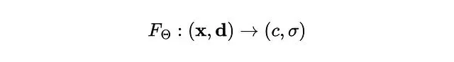 输入是位置 x = (x, y, z) 和观察方向 d = (θ, φ),输出是颜色 c = (r, g, b) 和密度 σ。整个5D映射用MLP来近似。