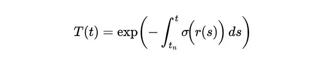 密度σ描述的是某点对光线的阻挡程度,可以理解为吸收概率。更严格地说它是光线在该点终止的微分概率。根据这个定义,光线从t传播到tₙ的透射概率可以表示为: