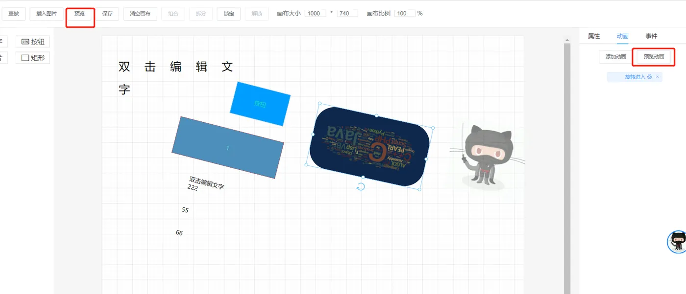 界面逻辑很“产品化”:上方工具栏、左侧组件区、中间画布、右侧属性/动画/事件面板——你一眼就知道该点哪里。