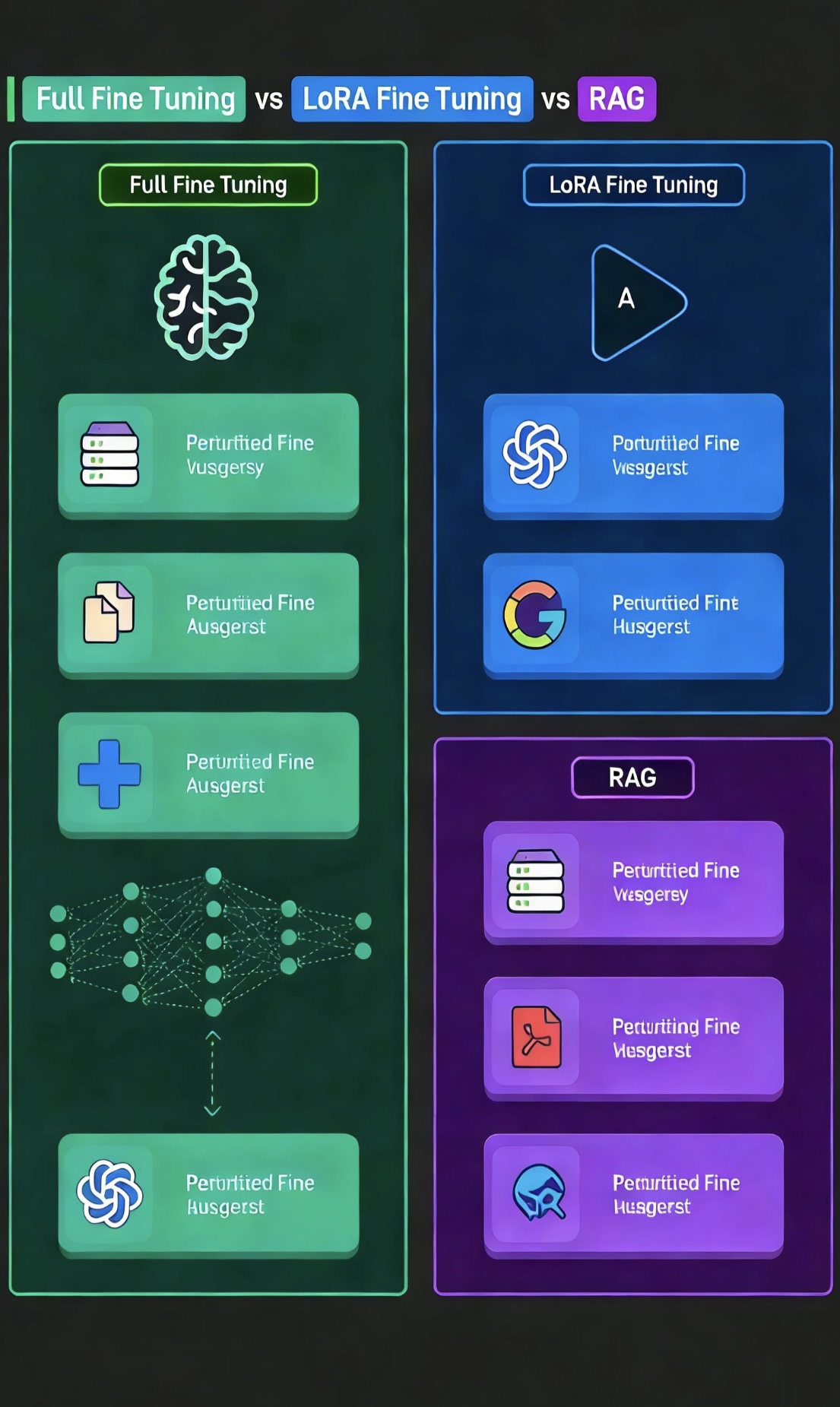 - 全参数微调:送他回法学院/工程学院,花巨资让他重学一遍专业课程。(成本高,效果深)